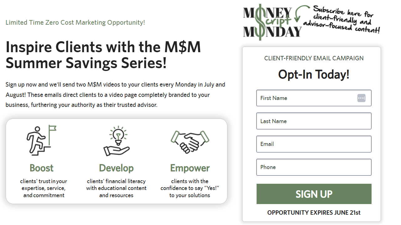 I put hours into producing this, and I wanted to increase its longevity and utility. I wrote an email campaign tying together content to deliver a concept-driven story to repurpose the content, resulting in the revival of some incredibly valuable content. Since advisors experience a slowdown in business over Summer, the solution was truly twofold because it kept them consistently engaged with clients. All resources from the Money Script Monday series were branded to the advisor and their business, keeping the authority our partners while we drive their business in the background.